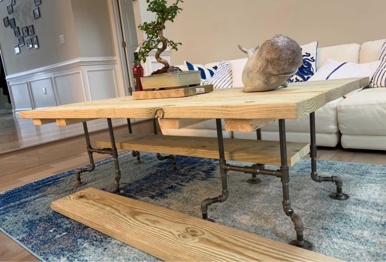 Beneath this is a secondary shelf that provides ample space for books, decorative items, or simply a convenient spot to tuck away the remote. The pipe legs provide stability and visual interest with the curves in their design, complementing the simplicity of the wood table top. The added accessories turned this simple coffee table into a unique centerpiece that brings warmth and character to the space.
