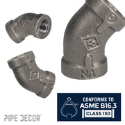 Go in a different direction with 45-degree elbows. They’re perfect for building pipe furniture with unique shapes. Create a one-of-a-kind shelf, lamp, or a piece of art that perfectly fits your space. Our fittings are made with durable, industrial-grade malleable iron. Fittings are 100% authentic and are made to stand the test of time. You will know PIPE DECOR parts and accessories when you hold them. Beauty and beast. Strength and style. These are real industrial fittings for your decorations and designs. Accept no substitutes. Extra pieces and accessories are available for your custom projects and expansions. Plug and play as desired.