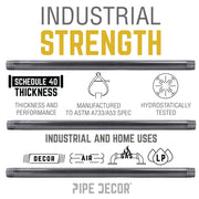 PIPE DECOR pre-cut pipe can be used for either plumbing or decor installations. This is genuine schedule 40 black steel pipe that has been hydrostatically tested and is ASTM and ASME compliant. Each pipe comes pre-threaded, is free of any stickers, and comes coated in a light industrial oil to prevent rusting. Ideal for pipe decor, or use in standard gas, air, and liquid propane applications. Quality industrial black steel complements any aesthetic. IPS threads offer compatibility with other project materials such as lamp parts, valves, and more. Our PIPE DECOR line contains an array of fittings and connectors to create a variety of projects. Build your own or use with our pipe kits to achieve a custom look. Pipe will require cleaning and sealing prior to use.