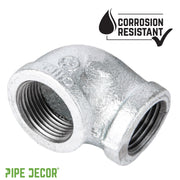 Having trouble connecting two pipes of different diameters? You need a galvanized reducing elbow. Fit that bigger or smaller pipe into your next pipe project. Create a unique visual effect by using two different pipe sizes in you DIY projects. Galvanized fittings are silver in color with a shiny finish that brings a clean, polished look to your pipe furniture. Our fittings are made with durable, industrial-grade malleable iron. Fittings are 100% authentic and are made to stand the test of time. You will know PIPE DECOR parts and accessories when you hold them. Beauty and beast. Strength and style. These are real industrial fittings for your decorations and designs. Accept no substitutes. Extra pieces and accessories are available for your custom projects and expansions. Plug and play as desired.