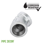 Go in a different direction with galvanized 45-degree elbows. They’re perfect for building pipe furniture with unique shapes. Create a one-of-a-kind shelf, lamp, or a piece of art that perfectly fits your space. Galvanized fittings are silver in color with a shiny finish that brings a clean, polished look to your pipe furniture. Our fittings are made with durable, industrial-grade malleable iron. Fittings are 100% authentic and are made to stand the test of time. You will know PIPE DECOR parts and accessories when you hold them. Beauty and beast. Strength and style. These are real industrial fittings for your decorations and designs. Accept no substitutes. Extra pieces and accessories are available for your custom projects and expansions. Plug and play as desired.