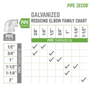 Having trouble connecting two pipes of different diameters? You need a galvanized reducing elbow. Fit that bigger or smaller pipe into your next pipe project. Create a unique visual effect by using two different pipe sizes in you DIY projects. Galvanized fittings are silver in color with a shiny finish that brings a clean, polished look to your pipe furniture. Our fittings are made with durable, industrial-grade malleable iron. Fittings are 100% authentic and are made to stand the test of time. You will know PIPE DECOR parts and accessories when you hold them. Beauty and beast. Strength and style. These are real industrial fittings for your decorations and designs. Accept no substitutes. Extra pieces and accessories are available for your custom projects and expansions. Plug and play as desired.