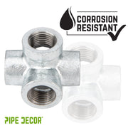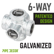 Our galvanized fittings are silver in color with a shiny finish that brings a clean, polished look to your pipe furniture. Use a 6-way fitting as the center of a pipe light fixture or for other creative projects. The sky’s the limit!