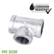 Reducing tees give you the flexibility to build the project of your dreams. You can use a galvanized reducing tee in almost any project that you would normally use a regular tee for, as long as the smaller pipe size can support the right amount of weight for your project. Using two different pipe sizes can make for a unique visual effect. Galvanized fittings are silver in color with a shiny finish that brings a clean, polished look to your pipe furniture. Our fittings are made with durable, industrial-grade malleable iron. Fittings are 100% authentic and are made to stand the test of time. You will know PIPE DECOR parts and accessories when you hold them. Beauty and beast. Strength and style. These are real industrial fittings for your decorations and designs. Accept no substitutes. Extra pieces and accessories are available for your custom projects and expansions. Plug and play as desired.