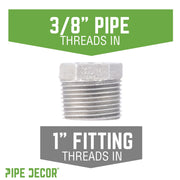 Make your standard fittings more versatile with our galvanized bushings. A bushing can be used in any project that involves connecting a larger fitting with a smaller pipe. Make the most of your DIY creations. Galvanized fittings are silver in color with a shiny finish that brings a clean, polished look to your pipe furniture. Our fittings are made with durable, industrial-grade malleable iron. Fittings are 100% authentic and are made to stand the test of time. You will know PIPE DECOR parts and accessories when you hold them. Beauty and beast. Strength and style. These are real industrial fittings for your decorations and designs. Accept no substitutes. Extra pieces and accessories are available for your custom projects and expansions. Plug and play as desired.