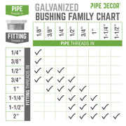 Make your standard fittings more versatile with our galvanized bushings. A bushing can be used in any project that involves connecting a larger fitting with a smaller pipe. Make the most of your DIY creations. Galvanized fittings are silver in color with a shiny finish that brings a clean, polished look to your pipe furniture. Our fittings are made with durable, industrial-grade malleable iron. Fittings are 100% authentic and are made to stand the test of time. You will know PIPE DECOR parts and accessories when you hold them. Beauty and beast. Strength and style. These are real industrial fittings for your decorations and designs. Accept no substitutes. Extra pieces and accessories are available for your custom projects and expansions. Plug and play as desired.