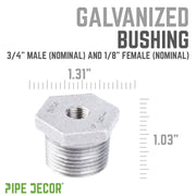 Haga que sus accesorios estándar sean más versátiles con nuestros casquillos galvanizados. Un casquillo se puede usar en cualquier proyecto que implique conectar un accesorio más grande con una tubería más pequeña. Saque el máximo provecho de sus creaciones de bricolaje. Los accesorios galvanizados son de color plateado con un acabado brillante que aporta un aspecto limpio y pulido a sus muebles de tubería. Nuestros accesorios están fabricados con hierro maleable duradero de grado industrial. Son 100 % auténticos y están fabricados para resistir el paso del tiempo. Reconocerá las piezas y accesorios de PIPE DECOR al tocarlos. Belleza y bestia. Resistencia y estilo. Son auténticos accesorios industriales para sus decoraciones y diseños. No acepte sustitutos. Disponemos de piezas y accesorios adicionales para sus proyectos y ampliaciones personalizados. Conéctelos y úselos como desee.