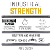 Los tubos precortados PIPE DECOR se pueden usar tanto para instalaciones de plomería como para decoración. Se trata de tubos genuinos de acero negro cédula 40, sometidos a pruebas hidrostáticas y conformes con las normas ASTM y ASME. Cada tubo viene preroscado, sin adhesivos y recubierto con un aceite industrial ligero para evitar la oxidación. Ideales para la decoración de tuberías o para aplicaciones estándar de gas, aire y propano líquido.
