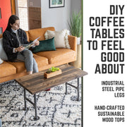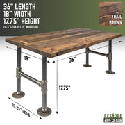- Cada kit de mesa de centro contiene una mesa de madera recuperada de 18 pulgadas x 36 pulgadas x 1,25 pulgadas con bordes acolchados y un juego de patas de tubo en "H".