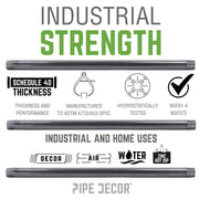 Los tubos precortados PIPE DECOR se pueden usar tanto para instalaciones de plomería como de decoración. Se trata de tubos genuinos de acero galvanizado cédula 40, sometidos a pruebas hidrostáticas y que cumplen con las normas ASTM y ASME. Cada tubo viene preroscado y sin adhesivos.