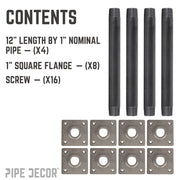 • Each kit comes with (4) 1 in. x 12 in. steel pipes, eight square flanges, (16) screws, assembly instructions and a clean and seal sheet