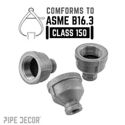 These cylindrical fittings are used to connect two pipes of different diameters. You can use a reducing coupling to add height or length to table legs, bar stool legs, clothing racks, and more by attaching two pipes together. Our fittings are made with durable, industrial-grade malleable iron. Fittings are 100% authentic and are made to stand the test of time. You will know PIPE DECOR parts and accessories when you hold them. Beauty and beast. Strength and style. These are real industrial fittings for your decorations and designs. Accept no substitutes. Extra pieces and accessories are available for your custom projects and expansions. Plug and play as desired.