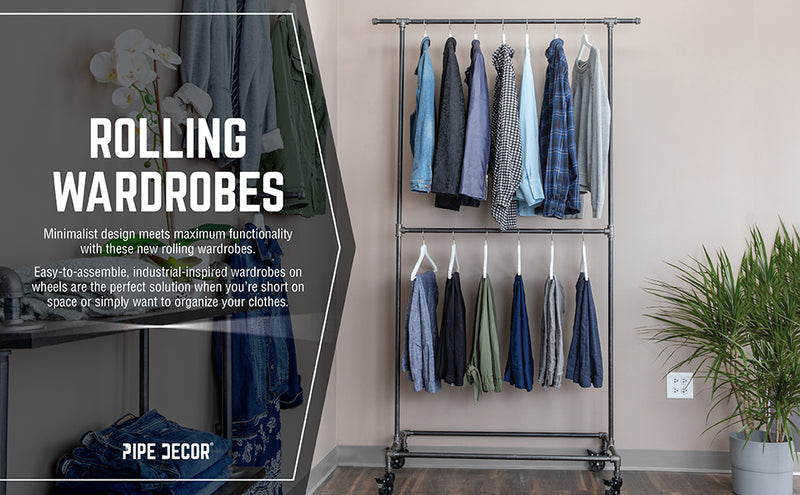 Minimalist design meets maximum functionality. Our rolling wardrobe is the perfect way to display your unique fashion sense in your home or retail space. Mix and match with other DIY pipe furniture kits to create the open wardrobe of your dreams. This easy-to-assemble wheeled clothing rack will have your room looking organized in no time. Use it in the bedroom or turn it into a convenient coat hanger for your guests in the living room. Not only is it good for home use, but this versatile rolling wardrobe can also be used in your business. It’s great for displaying clothing in a boutique or shop. An industrial clothing rack is a great way to showcase your unique fashion and keen eye for modern design. This is a great option for those short on storage space. The height provides ample hanging space from the top bar to accommodate dresses, pants, and more. The caster wheels have a 360-degree swivel supported by sturdy ball bearings, so you can smoothly maneuver into tight spaces with no squeaking noise and no floor scuffing.
