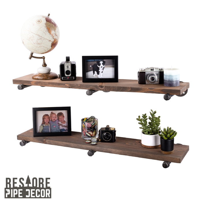 Accent your space with a genuine industrial pipe and real American wood shelf set. Our latest Pipe Decor shelves are comprised of genuine industrial pipes, flanges and sustainably-sourced Ponderosa pine lumber. These heavy-duty shelves make an excellent complement to any bar, den, garage or space of your choosing and fit across a spectrum of vintage to modern design styles. We have taken extra care in assembling this set and want you to know that you are getting a quality product made with real pipe and genuine USA pine. The included wooden boards measure 1 in. x 7.5 in. x 36 in., the kit includes 2-boards and 6-brackets. Assembly is required. All necessary screws and anchors are included.